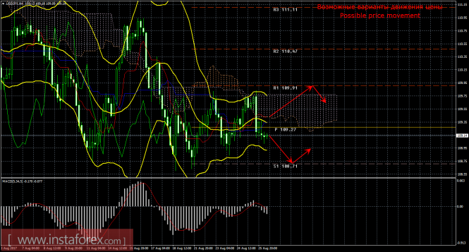 Анализ пары доллар/иена на рынке Форекс 28 августа показывает, что цена отработала линию Сенкоу Спан Б и начала новый виток коррекционного движения. Текущий «золотой крест» является подтвержденным и слабым, так как Чинкоу Спан закрепился выше графика цены, а цена располагается уже ниже облака Ишимоку. Поэтому сейчас целью для движения вверх является уровень сопротивления 109,91, но рассматривать лонги можно будет только выше облака. Если этот таргет будет преодолен, то новой целью будет выступать второй уровень сопротивления 110,47. Восходящее движение актуально до тех пор, пока цена находится выше критической линии Киджун-сен (109,35). Сейчас цена закрепилась ниже этой линии, поэтому «золотой крест» ослаблен до предела, движение вверх – стало не актуальным, нисходящее движение может продолжиться с целью уровень поддержки 108,71. Боллинджер Бандс показывает начало нисходящего(!!!) движения, полосы не расширяются, но развернулись вниз, поэтому сейчас на рынке рекомендуется рассматривать варианты ордеров на продажу, что не соответствует «золотому кресту». MACD направлен вниз, сигнализируя о текущем нисходящем движении. Разворот индикатора наверх укажет на возможное возобновление движения вверх. В ближайшие часы может сформироваться «мертвый крест». Амплитуда инструмента в пятницу составила 72 пункта, а пройденная дистанция – 204 пункта, что означает среднюю по силе волатильность инструмента.