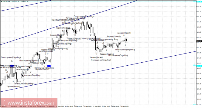 Две бычьи свечные формации «Поглощение», образовавшиеся на 4-часовом графике, поддержали рост котировок в направлении коррекционного уровня 261,8% - 135,90. Образование 2 октября медвежьей формации позволит рассчитывать на разворот в пользу валюты Японии и некоторое падение в направлении уровня коррекции 200,0% - 130,92. Равноудаленный канал, имеющий направление «вверх», делает коррекционной любую медвежью формацию. Закрепление котировок под уровнем Фибо 200,0% повысит вероятность продолжения падения в направлении уровня коррекции 161,8% - 127,87.