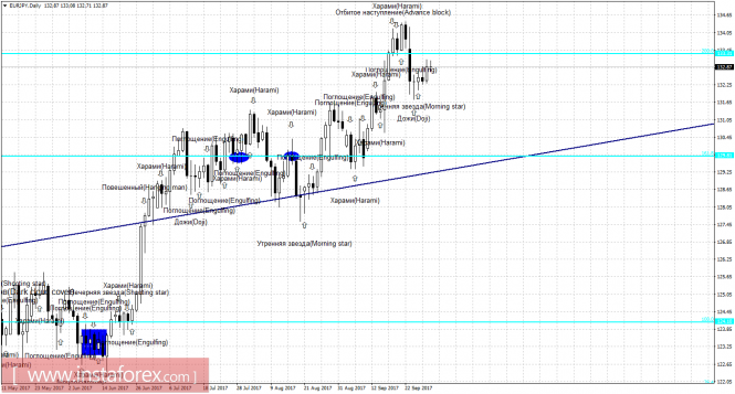 Пара EUR/JPY на 24-часовом графике, после образования бычьих свечных формаций «Дожи» и «Утренняя звезда», продолжает процесс возврата к уровню Фибо 200,0% - 133,31. Образование медвежьей формации сработает в пользу японской валюты и возобновления падения пары в направлении уровня коррекции 161,8% - 129,81. Такая формация будет трактоваться как коррекционная, исходя из направления равноудаленного канала «вверх». Закрепление котировок над уровнем коррекции 200,0% повысит шансы пары на продолжение роста в направлении следующего уровня Фибо 261,8% - 139,01.