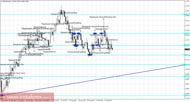 Бычья формация «Поглощение» позволяла котировкам NZD/USD продолжить рост, но медвежья свечная формация «Вершина пинцет» сработала в пользу доллара США и очередного падения в направлении коррекционного уровня 50,0% - 0,7187. Еще один отбой котировок от уровня фибо 50,0% вновь сработает в пользу новозеландской валюты и возобновления процесса роста в направлении уровня коррекции 38,2% - 0,7275. Образование бычьей формации повысит шансы на отбой от уровня Фибо 50,0%. Закрепление котировок под уровнем коррекции 50,0% повысит шансы на дальнейшее падение в направлении уровня коррекции 61,8% - 0,7101.