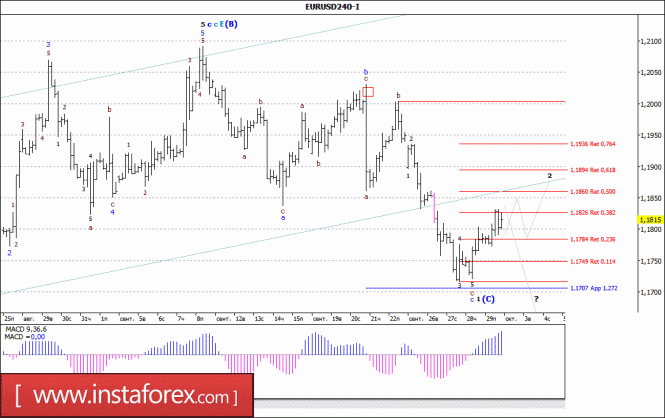 С началом пятничной европейской сессии пара EUR/USD продолжила восходящее движение и уже в середине дня пробила отметку 1,1830. При этом похоже на то, что валютная пара подтвердила завершение формирования предполагаемой 1-й волны, в (С) и обозначила начало 2-й волны, в (С). В то же время следует отметить, что в случае возобновления валютной парой снижения котировок, все нисходящее движение, развивающееся от максимума 20 сентября (1,2030), примет вид пятиволновой структуры что, вероятно, потребует внесения соответствующих корректировок в его сложившуюся ранее волновую разметку.