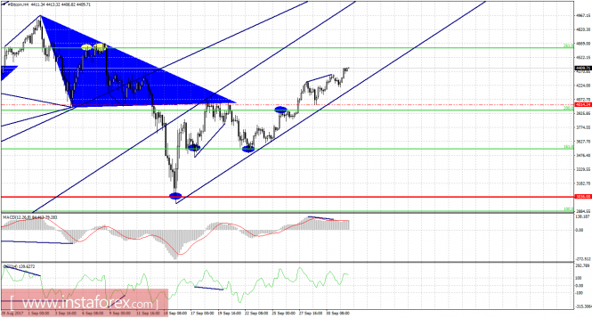 После закрепления котировок биткоина над уровнем Фибо 200,0% - 3960,00$, криптовалюта возобновила свой рост в направлении коррекционного уровня 261,8% - 4618,00$. Равноудаленный коридор остается рабочим. Небольшая дивергенция у индикатора MACD позволила котировкам лишь немного отойти вниз, после чего был возобновлен рост.