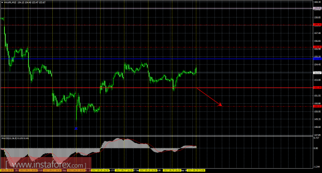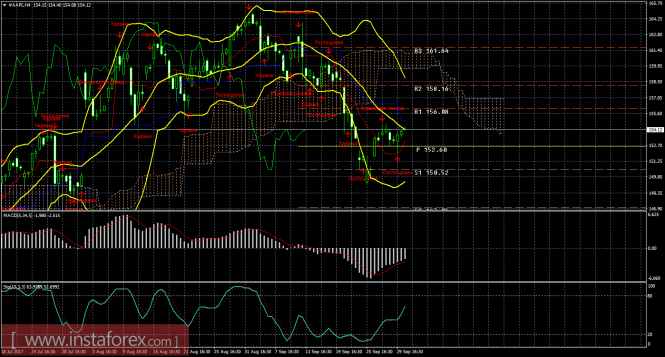 На 15-минутном графике рекомендуется рассматривать ордера на продажу с целью 150,52 при закреплении цены ниже 152,28(Тенкан-сен), ордером Stop Loss выше 152,28 и при направленном вниз индикаторе MACD.