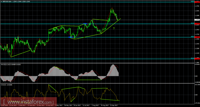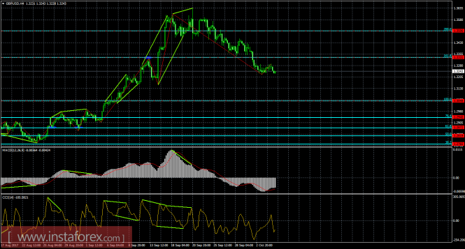 На 24-часовом графике падение пары также продолжается, в направлении коррекционного уровня 161,8% - 1,3105. 5 октября назревает бычья дивергенция у индикатора CCI: последний лоу индикатора уже ниже предыдущего, а аналогичный лоу пары может получиться выше. Дивергенция позволит трейдерам ожидать разворот в пользу английского фунта и некоторый рост в направлении уровня Фибо 100,0% - 1,3835. Отбой котировок от уровня коррекции 161,8% аналогично сработает в пользу начала роста пары. Закрепление курса под уровнем коррекции 161,8% повысит вероятность продолжения падения в направлении следующего уровня Фибо 200,0% - 1,2653.