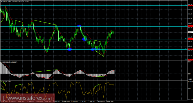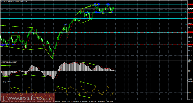 Отбой котировок USD/JPY на 4-часовом графике от уровня коррекции 38,2% - 112,32 и бычья дивергенция позволили выполнить разворот в пользу американской валюты и начать рост в направлении коррекционного уровня 23,6% - 113,16. Отбой курса пары 5 октября от уровня Фибо 23,6% позволит рассчитывать на разворот уже в пользу валюты Японии и возврат к уровню коррекции 38,2%. Назревающих дивергенций сейчас не видно. Закрепление курса пары под уровнем Фибо 38,2% повысит вероятность дальнейшего падения в направлении коррекционного уровня 50,0% - 111,66.