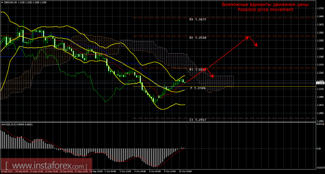 Сведения о том, что КНДР обладает необходимым потенциалом, для того чтобы нанести удар по Америке, негативно сказались на американской валюте во вторник, 10 октября. На некоторое время трейдеры забыли о политической напряженности в Великобритании, а также о продолжающихся переговорах по условиям Brexit между ЕС и Британией и о том, что консенсус еще очень далек. Второй день подряд фунт стерлингов дорожает. Также поддержку английской валюте вчера оказали данные о промышленном производстве, по итогам августа этот показатель вырос на 1,6% в годовом выражении и о производстве в секторе обрабатывающей промышленности, этот показатель вырос на 2,8% в годовом выражении. Таким образом, весь новостной фон вчера был на стороне фунта стерлингов. В нашем распоряжении сейчас имеется сигнал «золотой крест», однако цена по-прежнему располагается ниже облака Ишимоку, поэтому ордера на покупку сейчас не актуальны. Рассматривать длинные позиции можно будет не ранее закрепления цены выше облака с целью второй уровень сопротивления 1,3538. Полосы Боллинджера развернулись вверх, указываю на восходящую тенденцию. Если индикатор MACD развернется вниз, это просигнализирует о начале нисходящей коррекции. Волатильность по инструменту остается прежней – около 100 пунктов в день.