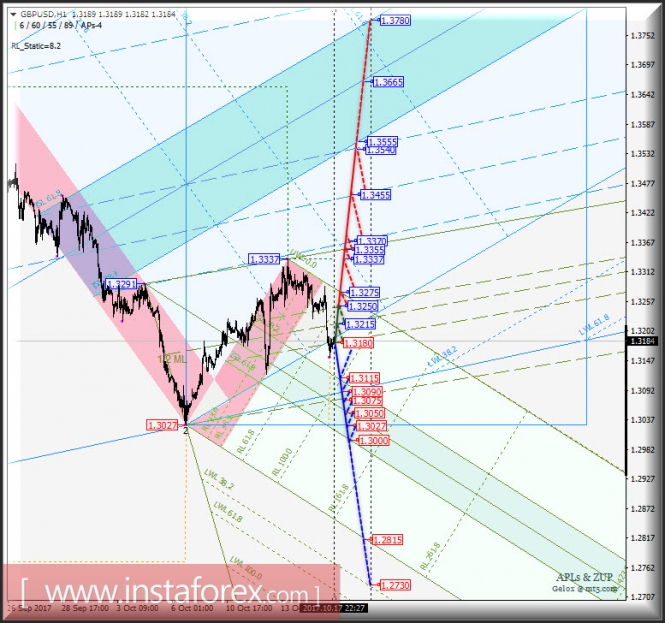 Развитие движения цены инструмента (GBP/USD) 18 - 25 октября 2017 г. будет обусловлено отработкой границ канала 1/2 Median Line (1.3250 <-> 1.3215 <-> 1.3180) вил операционного масштаба Micro.