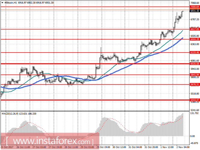 Психологический уровень 7000 usd вот-вот будет достигнут, и сумеют ли покупатели его преодолеть, будет зависеть от новостей из Китая. Закрепление выше 7000 открывает потенциал к дальнейшему росту в район 7200 и 7500 за один биткоин. В случае неудачного закрепления выше 7000 не исключена нисходящая коррекция. В таком случае к покупкам лучше возвращаться на отскок от 6617.