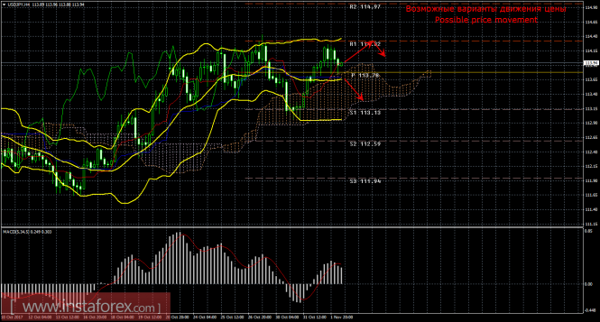 Валютная пара USD/JPY в четверг, 1 ноября, так же как и евровалюта, практически никак не отреагировала на макроэкономические новости из Америки. Заседание FOMC прошло без каких-либо последствий для инструмента, а участники рынка теперь будут ждать повышения ключевой ставки ФРС в декабре, на последнем заседании регулятора в этом году. Также стоит отметить, что в ближайшие дни Дональд Трамп должен назвать имя преемника Джанет Йеллен в кресле председателя ФРС. Больше всего шансов возглавить ФРС у Джером Пауэлла, который считается приверженцем «голубиной» политики. Его назначение может негативно сказаться на позициях американской валюты, однако, только в очень краткосрочной перспективе. Джанет Йеллен уйдет со своего поста только в январе, а до этого момента ФРС еще успеет как минимум один раз ужесточить монетарную политику. Полосы Боллинджера сейчас наиболее красноречиво показывают текущую тенденцию по валютной паре. Они направлены вбок, но располагаются довольно широко. Таким образом, от верхней полосы может последовать движение в нижней полосе, его можно будет идентифицировать по закреплению цены ниже линии Киджун-сен. Это, в свою очередь, ослабит текущий «золотой крест», а ордера на покупку станут на время не доступными для открытия. Волатильность инструмента в среду снизилась до 66 пунктов.