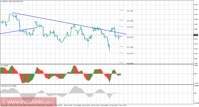 Цена на природный газ в среду, 1 ноября, продолжала корректироваться против восходящей тенденции, которая образовалась после преодоления нисходящей линии тренда. Сомнения в том, что инструмент сможет продолжить движение вверх, остаются. Однако формально сейчас являются актуальными ордера на покупку. Если цена останется выше уровня сопротивления R2 – 2,8970, то восходящее движение сможет возобновиться с целями уровни сопротивления 3,0100 и 3,0800. Еще одно преодоление уровня 2,8970 может спровоцировать возобновление нисходящего тренда. В целом динамика инструмента сейчас оставляет желать лучшего.
