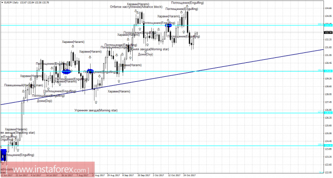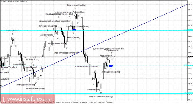 Сразу три медвежьи формации, «Харами», «Харами» и «Длинноногий Дожи», не смогли остановить процесс роста пары EUR/JPY на 4-часовом графике в направлении уровня коррекции 161,8% - 133,77. А бычья формация «Поглощение» и отбой от уровня Фибо 127,2% - 132,44 сработали в пользу европейской валюты и продолжения роста. Образование 2 ноября новой медвежьей формации вновь позволит трейдерам ожидать разворот в пользу валюты Японии и возврат к уровню коррекции 127,2%. Закрепление курса пары под этим уровнем повысит шансы на продолжение падения в направлении следующего уровня Фибо 100,0% - 131,39.