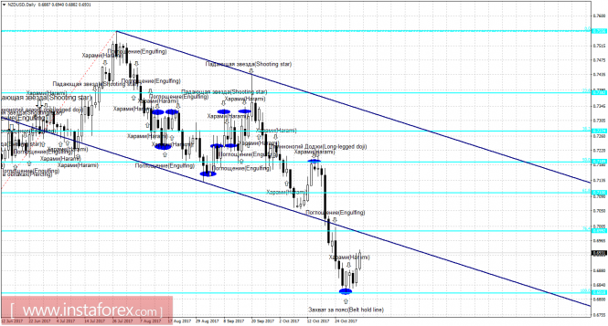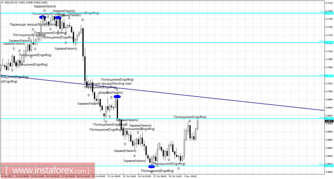 Медвежья формация «Поглощение», образовавшаяся на 4-часовом графике, позволила паре NZD/USD выполнить лишь небольшое падение, после чего процесс рост был возобновлен к уровню Фибо 161,8% - 0,6937. Отбой котировок 2 ноября от уровня коррекции 161,8% позволит ожидать разворот в пользу валюты США и некоторое падение в направлении коррекционного уровня 200,0% - 0,6820. Образование медвежьей формации будет трактоваться как трендовый сигнал, и повысит шансы пары на отбой от уровня Фибо 161,8%. Закрепление котировок над уровнем коррекции 161,8% сработает в пользу продолжения роста в направлении следующего уровня Фибо 127,2% - 0,7043.