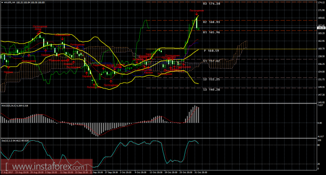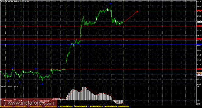 На 15-минутном графике рекомендуется рассматривать ордера на покупку с целью 168,93, при открытии или закреплении выше 165,96 и ордером Stop Loss ниже 165,96, а также при направленном вверх MACD.