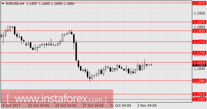 В еврозоне Manufacturing PMI в финальной оценке за октябрь был понижен до 58,5 с 58,6. В США еженедельное число обращений за пособиями по безработице снизилось с 234К до 229К, что уже меньше показателей до ураганов. Затраты на рабочую силу в 3-м квартале увеличились на 0,5% против 0,3% во 2-м квартале. Уровень производительности в несельскохозяйственном секторе за этот же период возрос на 3,0% против прогноза 2,4%. Всё это даёт основание с оптимизмом смотреть на сегодняшние данные по труду. Прогноз по Non-Farm Employment Change за октябрь 310-312 тыс.