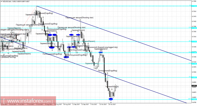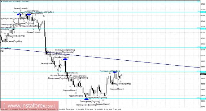 Две бычьи свечных формации «Харами» и «Поглощение» позволили паре NZD/USD выполнить разворот в пользу валюты Новой Зеландии и начать возврат к уровню Фибо 161,8% - 0,6937. Отбой котировок 3 ноября от уровня коррекции 161,8% позволит трейдерам ожидать разворот в пользу доллара США и некоторое падение в направлении коррекционного уровня 200,0% - 0,6820. Образование медвежьей формации будет трактоваться, как трендовый сигнал, и повысит шансы пары на отбой от уровня коррекции 161,8%. Закрепление курса пары над уровнем коррекции 161,8% сработает в пользу дальнейшего роста в направлении следующего уровня Фибо 127,2% - 0,7043.