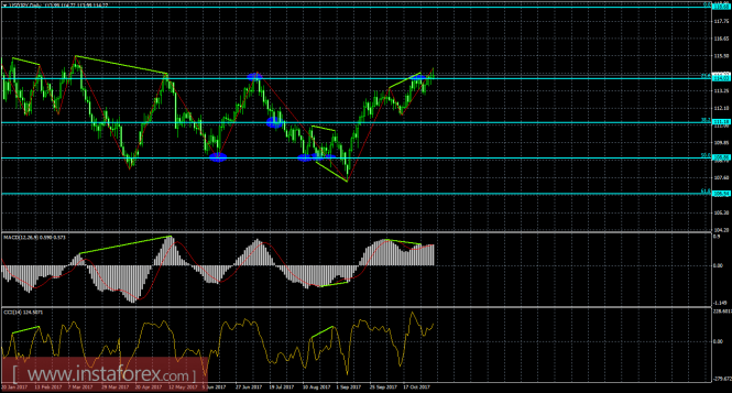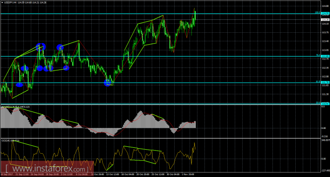 Пара USD/JPY на 24-часовом графике выполнила возврат к уровню коррекции 23,6% - 114,03 и закрепление немного выше него. Однако полноценным закреплением это все еще считать нельзя. Определять внутридневную тенденцию по паре сейчас рекомендуется по 4-часовом графике, так как на текущем графике нет никаких сигналов и вызывает множество вопросов коррекционный уровень 23,6%, от которого цена и не выполнила отскок, и не преодолела его. Назревающих дивергенций сейчас не наблюдается ни у одного индикатора.