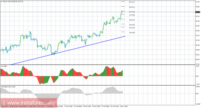 Котировки «черного золота» продолжают уверенное движение вверх, но в начале новой недели еще не успели преодолеть уровень сопротивления R1. Если этот таргет будет преодолен, то целями для восходящего движения будут выступать уровни сопротивления 56,70 и 57,47. Восходящая линия тренда продолжает поддерживать торгующих на повышение и делать актуальными ордера на покупку. Отчет Baker Hughes по количеству действующих нефтяных платформ в Штатах показал сокращение их общего количества на внушительные 8 единиц. Это и спровоцировало новый виток роста котировок нефти всех сортов.