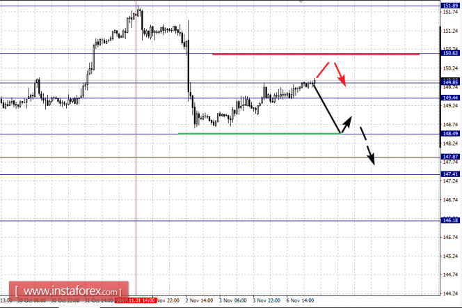 1 ноября, на текущий момент цена находится в коррекции. Продолжения движения книзу ожидаем после пробоя 148.49, в данном случае цель – 147.87, в коридоре