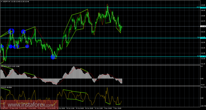 Пара USD/JPY на 4-часовом графике возобновила процесс падения, но, после образования бычьей дивергенции у индикатора CCI, выполнила разворот в пользу американской валюты и начала процесс роста в направлении коррекционного уровня 100,0% - 114,50. Проход парой последнего лоу дивергенции сработает в пользу возобновления падения котировок в направлении уровня Фибо 76,4% - 112,80 и отменит дивергенцию. Закрепление курса пары под уровнем коррекции 76,4% повысит вероятность дальнейшего падения в направлении следующего уровня Фибо 61,8% - 111,76.