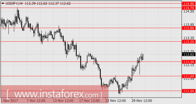 Как мы и предполагали, йена пытается быстрее удалиться от дна падения ниже 111.00, где оказалась 27 числа. Несомненно, ей в этом сильно помогает американский фондовый рынок, прибавивший за последние сутки 0,89% (S&P500). Вслед за ним третий день растёт и японский Nikkei225, сегодня индекс прибавляет 0,24%. Японские данные сегодня вышли умеренно-оптимистичные. Расходы домохозяйств в октябре показали нулевой прирост против прогноза -0,2% г/г. Уровень безработицы сохранился на низком уровне 2,8%. Базовый ИПЦ в ноябрьской оценке возрос с 0,7% г/г до 0,8% г/г. Индекс деловой активности в производственном секторе за ноябрь в финальной оценке немного подкачал – произошло понижение с 53,8 до 53,6. Но вчера на слабых данных японские ценности росли, что даёт нам основание более уверенного роста на сегодняшних показателях. Промышленное производство вчера показало октябрьский рост на 0,5% против ожидания 1,9%, и число закладки новых домов за этот же месяц снизилось в годовом исчислении с -2,9% г/г до -4,8% г/г при ожидании роста до -2,6% г/г.