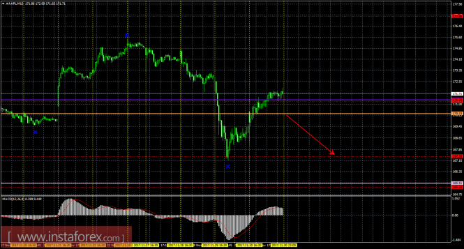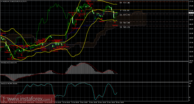 На 15-минутном графике рекомендуется рассматривать ордера на продажу с целями 167,38 и 165,24, при открытии или закреплении ниже 170,33 (Сенкоу Спан А) и ордером Stop Loss выше 170,33 и при направленном вниз индикаторе MACD.