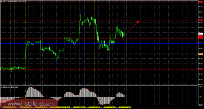 На младшем графике рекомендуется рассматривать ордера на покупку с целью 84,74 при закреплении цены выше 83,99, уровнем S/L ниже 83,99 и при направленном вверх MACD.
