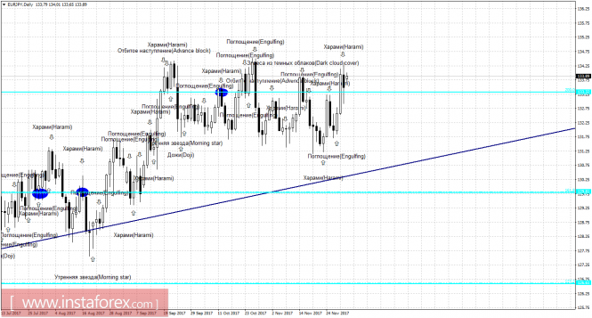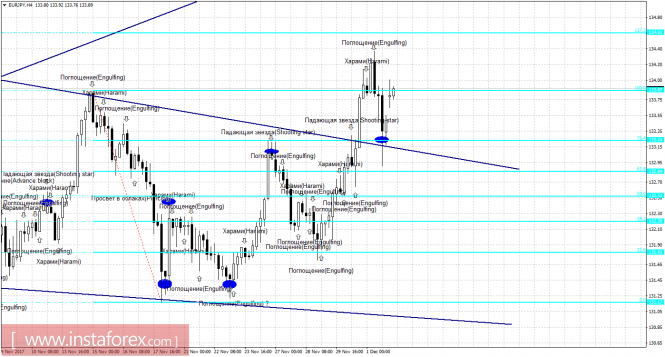 На 24-часовом графике котировки выполнили закрепление над уровнем коррекции 200,0% - 133,32. В итоге процесс роста котировок может быть продолжен в направлении следующего уровня Фибо 261,8% - 139,01. Однако закреплений над уровнем Фибо 200,0% было уже целых три и каждый раз выше отметки 134,50 уходить не удавалось. Помимо этого, медвежья формация «Харами» позволяет трейдерам ожидать некоторое падение котировок в направлении уровня коррекции 161,8% - 129,81. Образование бычьей формации будет трактоваться как трендовый сигнал и повысит шансы на продолжение роста.