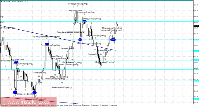 Медвежьи формации «Повешенный» и «Поглощение» позволяли паре EUR/JPY на 4-часовом графике начать процесс падения, однако отбой котировок от уровня Фибо 76,4% - 133,24 сработал в пользу европейской валюты и возобновления рост в направлении уровня коррекции 100,0% - 133,87. Отбой пары от уровня Фибо 100,0% позволит трейдерам ожидать разворот в пользу валюты Японии и некоторое падение в направлении уровня коррекции 76,4%. Образование медвежьей формации повысит шансы на отбой от уровня Фибо 100,0%. Закрепление котировок над уровнем Фибо 100,0% повысит шансы на дальнейший рост в направлении следующего уровня коррекции 127,2% - 134,61.