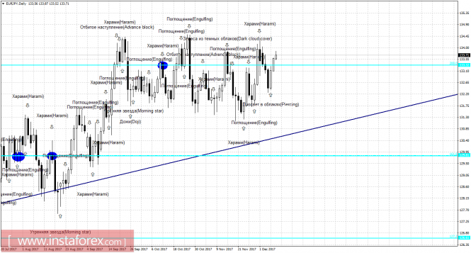 На 24-часовом графике, после образования бычьей свечной формации «Просвет в облаках», котировки выполнили разворот в пользу евровалюты и закрепление над уровнем Фибо 200,0% - 133,32. В итоге процесс роста может быть продолжен в направлении следующего уровня коррекции 261,8% - 139,01, однако, скорее всего, он будет прекращен в районе 134,50. Образование медвежьей свечной формации позволит трейдерам ожидать разворот в пользу валюты Японии и некоторое падение в направлении уровня коррекции 161,8% - 129,81(или отметки 131,50).