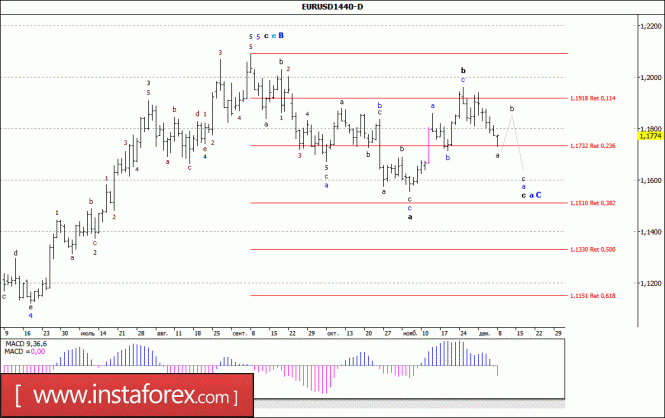 В целом ожидаемо, торги минувшей недели пара EUR/USD начала с нисходящего движения и, потеряв около 140 п.п., к закрытию пятничной сессии достигла отметки 1,1730. При этом можно предположить, что валютная пара предприняла попытку подтвердить переход в стадию формирования первых образующих волн в составе будущей волны с, в а, в С. Если это так, то у валютной пары могут появиться неплохие перспективы для продолжения снижения котировок в направлении уровня 15-й фигуры и далее, к 1,1400.