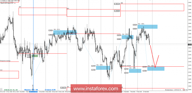 В пятницу пара подошла к определяющей поддержке НКЗ 1/2 0.8831-0.8823, что позволяет рассматривать два торговых плана. Первый план получит развитие в случае, если тест указанной зоны будет неудачным и будет получен паттерна на покупку в понедельник или вторник. В этом случае целью роста станет максимум прошлой недели. Если же одна из ближайших американских сессий закроется ниже уровня 0.8823, то это позволит рассматривать продажи, целью которых станет недельная КЗ 0.8743-0.8726.