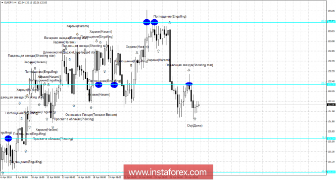 На 4-часовом графике медвежья свечная формация «Падающая звезда» и отбой от уровня Фибо 100,0% - 132,35 позволили паре EUR/JPY выполнить разворот в пользу японской валюты и начать падение в направлении коррекционного уровня 76,4% - 131,54. Бычья формация «Дожи» позволила приостановить процесс падения. Образование 1 мая новой медвежьей формации сработает в пользу возобновления падения котировок. Образование еще одной бычьей свечной формации позволит рассчитывать на разворот в пользу валюты ЕС и возврат к уровню коррекции 100,0%.