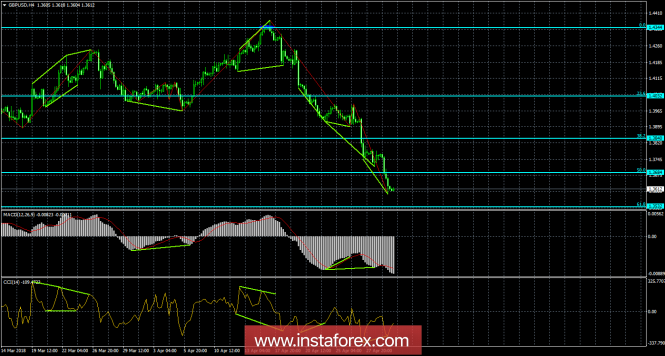 Пара GBP/USD на 4-часовом графике, после образования бычьей дивергенции у индикатора MACD, выполнила небольшой рост, после чего возобновила процесс падения и закрепилась под уровнем коррекции 50,0% - 1,3684. 2 мая образовалась новая бычья дивергенция у индикатора CCI, которая позволяет рассчитывать на разворот в пользу английской валюты и возврат к уровню Фибо 50,0%. Проход парой последнего дивергенционного лоу сработает в пользу продолжения падения в направлении коррекционного уровня 61,8% - 1,3532.