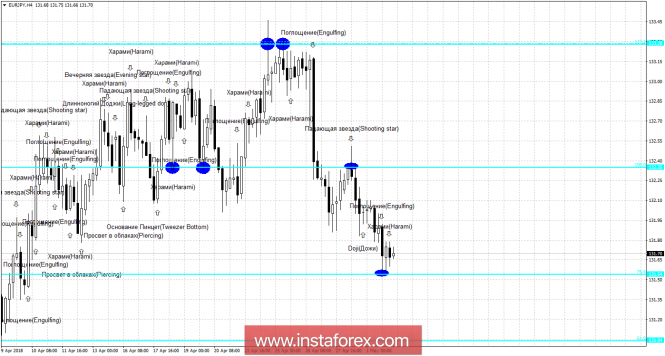 На 4-часовом графике котировки пары EUR/JPY выполнили падение к уровню коррекции 76,4% - 131,54. Отбой курса пары от уровня Фибо 76,4% позволил выполнить разворот в пользу валюты ЕС и начать рост в направлении коррекционного уровня 100,0% - 132,35. Образование 2 мая медвежьей формации позволит трейдерам ожидать разворот в пользу японской валюты и возврат к уровню коррекции 76,4%. Закрепление котировок под уровнем Фибо 76,4% повысит вероятность дальнейшего падения в направлении следующего уровня коррекции 61,8% - 131,04.