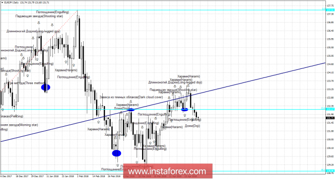 На 24-часовом графике пара выполнила закрепление под уровнем коррекции 23,6% - 132,17. В итоге падение котировок продолжается в направлении следующего коррекционного уровня 38,2% - 128,86. Образование бычьей свечной формации позволит трейдерам рассчитывать на разворот в пользу европейской валюты и некоторый рост пары. Закрепление курса над уровнем коррекции 23,6% аналогично можно будет трактовать как разворот в пользу евровалюты и ожидать некоторый рост в направлении уровня Фибо 0,0% - 137,51.