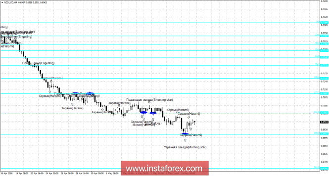 Бычья свечная формация «Утренняя звезда», образовавшаяся на 4-часовом графике, и отбой от уровня коррекции 200,0% - 0,6911 позволили котировкам NZD/USD выполнить разворот в пользу валюты Новой Зеландии и начать процесс роста в направлении коррекционного уровня 161,8% - 0,7003. Образование 11 мая медвежьей свечной формации позволит трейдерам ожидать разворот в пользу американской валюты и возврат к уровню Фибо 200,0%. Отбой котировок от уровня коррекции 161,8% аналогично сработает в пользу начала падения пары.