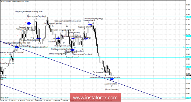 На 24-часовом графике пара выполнила падение к уровню коррекции 76,4% - 0,6936. Отбой котировок от уровня Фибо 76,4% и бычья свечная формация «Молот» позволяют рассчитывать на разворот в пользу новозеландской валюты и некоторый рост в направлении коррекционного уровня 61,8% - 0,7031. Закрепление курса пары под уровнем Фибо 76,4% повысит шансы на дальнейшее падение в направлении следующего уровня коррекции 100,0% - 0,6780.
