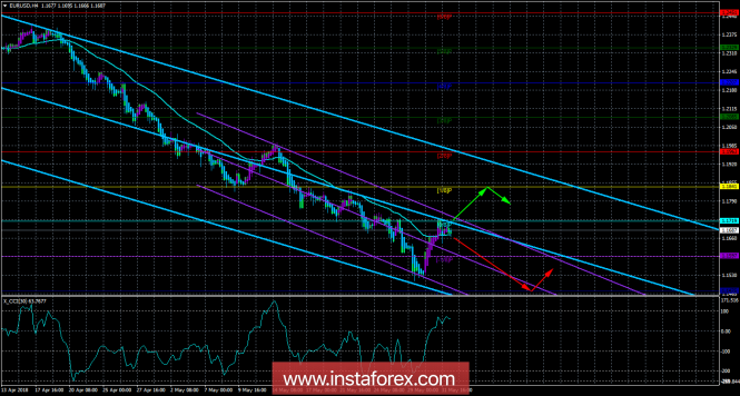 Валютная пара EUR/USD в четверг, 31 мая, продолжила несильное восходящее движение и сумела преодолеть скользящую среднюю линию и отработать уровень Мюррея «0/8». Однако с преодолением уровня 1,1719 возникли серьезные трудности, поэтому даже краткосрочные перспективы восходящего движения остаются туманными. Оба канала линейной регрессии по-прежнему направлены вниз, свидетельствуя о нисходящей тенденции по инструменту в среднесрочной и долгосрочной перспективах. Если сегодня макроэкономические отчеты по безработице, заработной плате и NonFarm Payrolls из США будут положительными, то трейдеры могут вернуться к покупкам доллара, что приведет к закреплению цены ниже мувинга и возобновлению нисходящего движения в краткосрочном плане. Лишь преодоление уровня 1,1719 укажет на определенную силу быков и позволит ожидать продолжение роста евровалюты.