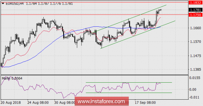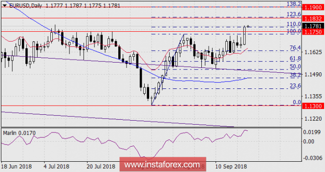 На четырёхчасовом графике разворотных паттернов нет, но наблюдается горизонтальный коридор по индикатору Марлин, который указывает на нехватку энергии для устойчивого роста. В подобных случаях может произойти кратковременный выход сигнальной линии из коридора вверх или вниз с возвратом в него. В нашем случае намечается выход вверх, цели обозначены: 1.1832, 1.1900.