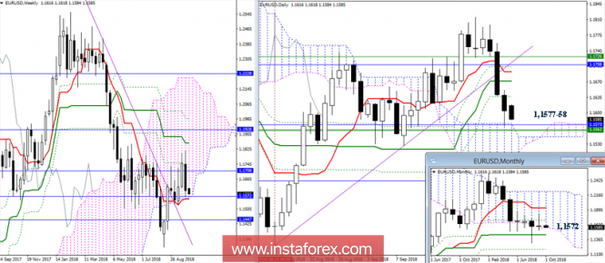 Сентябрь не изменил ситуацию. Пара по-прежнему, как и последние несколько месяцев, привязана к нижней границе месячного облака (Сенкоу Спан А 1,1572). В непосредственной близости сейчас находятся поддержки дневного и недельного облаков. В результате объединение этих уровней формирует для данного участка наиболее важную зону поддержки 1,1577-58 (дневной Сенкоу Спан Б + недельный Сенкоу Спан Б + месячный Сенкоу Спан Б + недельный Тенкан). Пробой и надёжное закрепление ниже сформирует понижательные цели, а также позволит с новыми силами приступить к ликвидации месячного золотого креста 1,1447 (Киджун) – 1,1186 (Фибо Киджун). В случае формирования сейчас полноценного отбоя от встреченных поддержек сначала будут рассматриваться варианты ретеста пройденных накануне уровней дневного золотого креста (1,1636 – 1,1671 – 1,1692) и ключевой зоны сопротивлений 1,1708-26 (Фибо Киджуны недель и месяца). По результатам тестирования можно будет определить дальнейшие варианты развития ситуации.