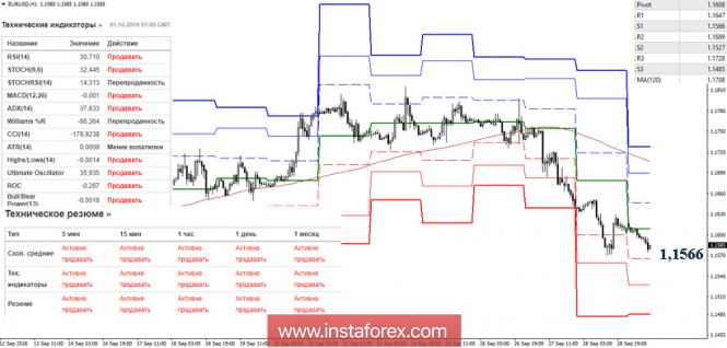 Индикаторный анализ в настоящее время полностью настроен на продажи. Предпочтения и преимущества сейчас на стороне игроков на понижение. Перемена в настроениях сегодня возможна лишь с зарождения восходящей коррекции. В результате в сложившейся ситуации желание продавать, нужно обязательно соизмерять с возможностями пробоя сильной зоны поддержек. От Пивот-уровня S1 (1,1566) сегодня очень велика вероятность формирования отбоя.
