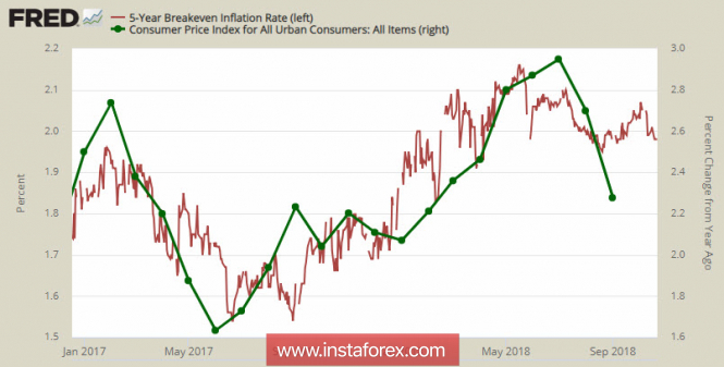 Инфляционные ожидания (доходность 5-летних облигаций TIPS) достигла максимума в мае 2018г, после чего наблюдается заметный спад. Бизнес не видит перспектив роста потребительских цен, отчасти это связно с укреплением индекса доллара, отчасти с сомнениями относительно устойчивости высокого потребительского спроса.