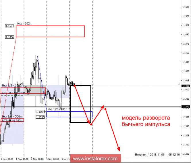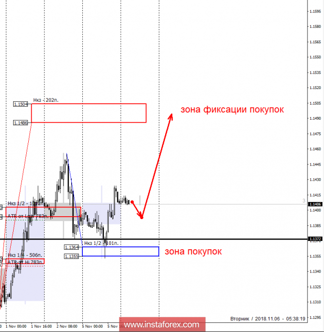 Вчера произошел тест НКЗ 1/2 1.1364-1.1355, которая является определяющей поддержкой при формировании бычьей среднесрочной модели. Удержание цены выше указывает на продолжение роста. Целью восходящего движения остается недельная КЗ 1.1504-1.1486, тест которой позволит закрыть часть покупок, а остальное перевести в безубыток. Вчерашние покупки от контрольной зоны можно будет перевести в безубыток после теста максимума прошлой недели. Покупки с текущих отметок уже не являются выгодными, так как не дают нужного отношения риска к прибыли.
