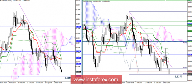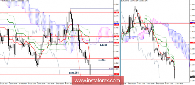 Поддержка дневной цели (1,1277) усиливает цель на пробой облака Н4 (1,1270). Исполнение целей может спровоцировать торможение. Пробой и закрепление ниже откроет дорогу для усиления медвежьих настроений и продолжения тренда. Сопротивления сегодня нужно отметить на 1,1301 – 1,1331 – 1,1384. Закрепление выше данных сопротивлений может повлиять на дальнейшее развитие ситуации и привести к формированию отбоя по итогу исполнения понижательных целей на 100%.