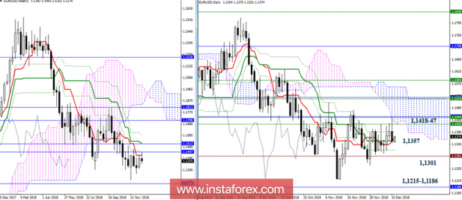 Встреча с важными сопротивлениями данного участка 1,1418-47 (дневное облако + недельный Тенкан + недельный Фибо Киджун + месячный Киджун) привела к формированию отбоя, в результате которого пара вернулась к центру притяжения сложившейся консолидации (1,1357 дневной крест). Для выхода из зоны консолидации игрокам на повышение нужно будет начинать всё сначала. Закрепление выше 1,1418-47 может создать условия для дальнейшего усиления бычьих настроений. Интересы медведей сейчас по-прежнему упираются в 1,1301 и 1,1215-1,1186.