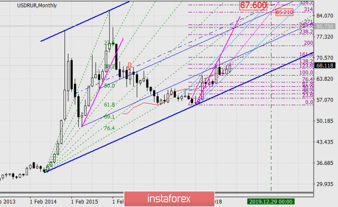 Наш основной, глобальный ценовой канал обозначен синим цветом, его крайние линии (границы) утолщены. В большинстве случаев цена отрабатывает середину канала, каким бы он ни был. В нашем случае это синяя штрихпунктирная линия, от которой цена развернулась вниз в июле 2016 года (момент отмечен красной стрелкой), но это было до формирования нижней точки синего гиперканала, теперь же цена стремится к «официально существующей» линии. Ориентир по силовой линии (тонкой розовой) нам даёт дату достижения ценой середины глобального канала – это аккурат последняя неделя 2019 года. Отмечено вертикальной зелёной штрихпунктирной линией. Целевой уровень – 87.60, он совпадает также с уровнем Фибоначчи 338,2%.