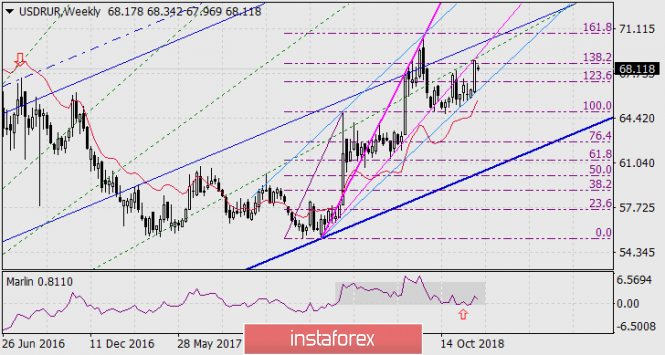 В качестве дополнения рассмотрим осциллятор Марлин, он поможет ответить с технической стороны на вопрос, почему рубль не показал сильный рост в текущем году. Как легко замечается, Марлин решительно не рос вслед за ценой, его сигнальная линия консолидировалась над нулевой линией, то есть, находясь в зоне роста (и рубль рос), он не сигнализировал о формировании какого-либо серьёзного тренда. Только в августе сигнальная линия нехотя вышла из консолидации вверх, но постаралась побыстрее вернуться обратно. Сила рынка сдерживалась, о чём мы и говорили выше. Теперь мы наблюдаем разворот сигнальной линии вверх от границы, разделяющей рост от падения тенденции. С выходом цены над значимый технический уровень (у нас это уровень Фибоначчи 138,2% и силовая линия с лучом Фибоначчи) индикатор Марлин перестраивается на сильное, а прежде всего устойчивое, трендовое движение.
