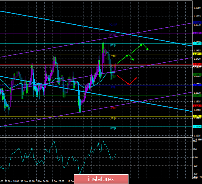 Второй торговый день недели на валютном рынке официально считается выходным в честь празднования Рождества. Рынки сегодня закрыты и откроются только завтра. Тем не менее определенный анализ валютной пары EUR/USD мы проведем. Первое, что следует сказать – о завершении нисходящего тренда по евро говорить еще слишком рано. Да, в течение полутора месяцев пара не обновляла минимум этого года, однако это не означает, что 2019 год будет для евровалюты удачнее. По-прежнему неизвестно, чем закончится эпопея с Brexit, которая имеет отношение и к Евросоюзу. Непонятно, когда ЕЦБ встанет на путь ужесточения монетарной политики. Непонятно, готова ли ФРС полностью завершить курс по повышению ключевой ставки или же просто замедлит его. Непонятно, останется ли Джером Пауэлл главой ФРС и как он в этом случае будет коммуницировать с Дональдом Трампом, который, по слухам, уже готов любыми способами избавиться от несговорчивого экономиста. Непонятно, и какими методами будет действовать Трамп на этот раз, чтобы реализовать свои планы и заодно снизить курс американской валюты. Таким образом, выводы следует делать по мере поступления новой макроэкономической информации. Технически же сейчас наблюдается некое подобие широкого флэта. Пара отработала уровень Мюррея «8/8», который является сильным сопротивлением. Поэтому возможно движение вниз.