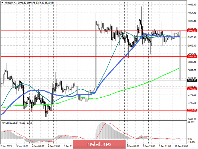 Медведи вернулись в рынок. Основной целью на сегодня является закрепление ниже поддержки 3 790, что приведет к дальнейшему снижению к минимуму 3 620, а затем и к минимуму от 28 декабря 3 520. Более серьёзной целью у медведей будут годовые минимумы по биткоину в район 3 000 USD. В случае краткосрочной восходящей коррекции, продажи можно смотреть на отскок от сопротивления 3 900.