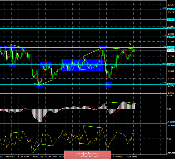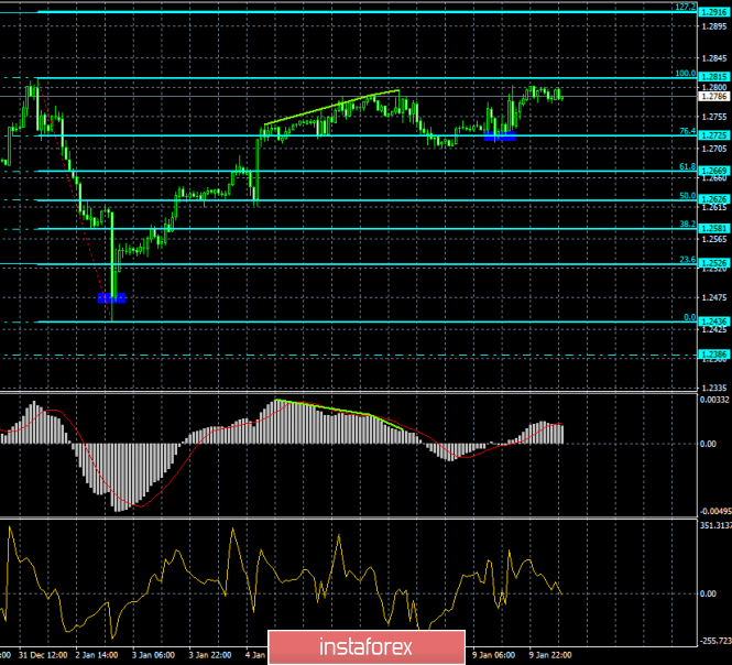 Пара GBP/USD на 4-часовом графике возобновила процесс роста в направлении коррекционного уровня 76,4% - 1,2812. Однако 10 января назревает новая медвежья дивергенция у индикатора MACD, которая позволяет трейдерам ожидать разворот в пользу американского доллара и некоторое падение в направлении уровня коррекции 100,0% - 1,2662. Отбой пары от уровня Фибо 76,4% аналогично сработает в пользу валюты США. Закрытие котировок над уровнем 76,4% повысит шансы на дальнейший рост в направлении следующего уровня Фибо 61,8% - 1,2905.